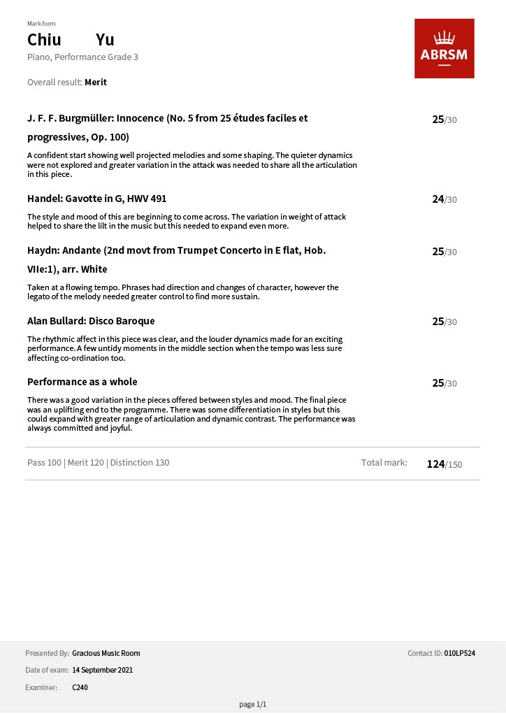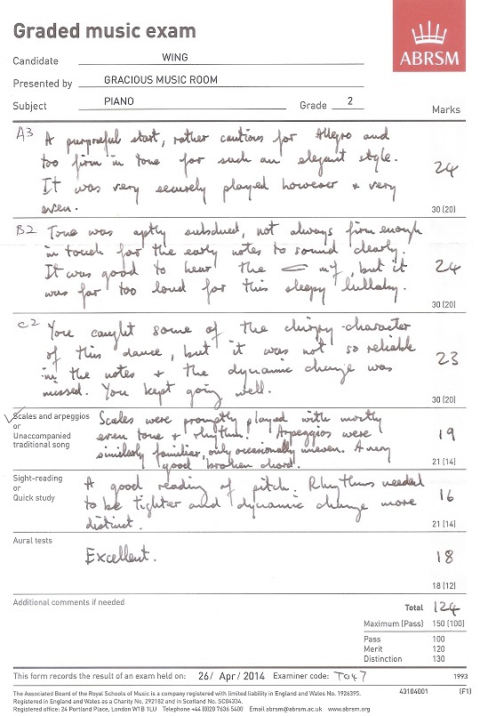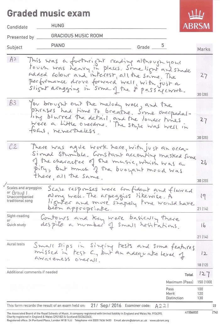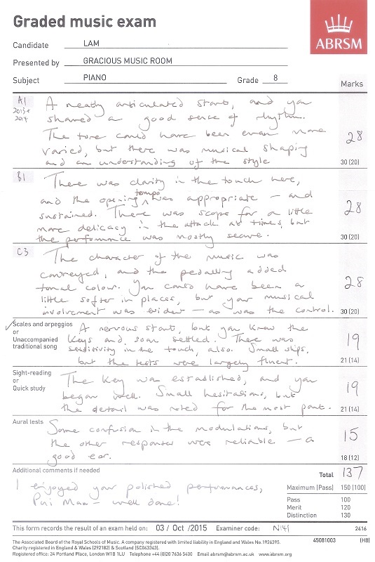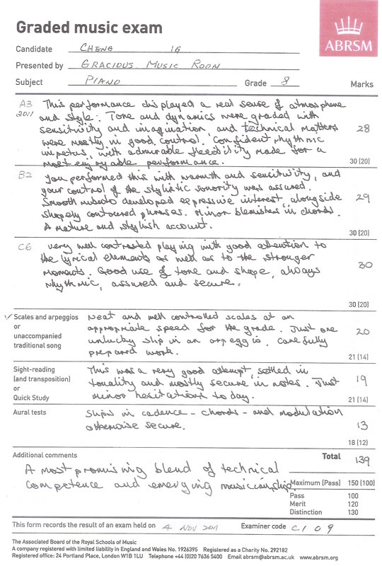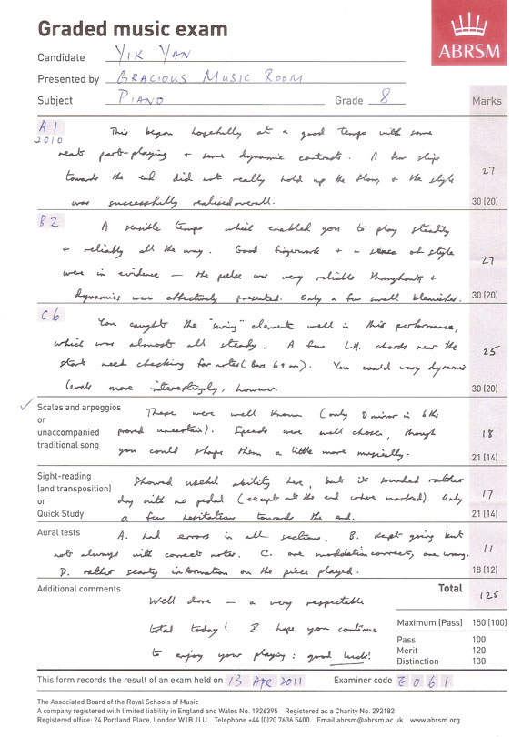鋼琴科學生成績